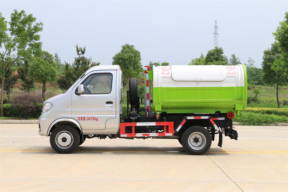 該款鉤臂式垃圾車由液壓系統、操作系統組成。舉升油制缸(1支)系國內知名液壓件廠家生產的雙作用油缸。垃圾廂可自吊上放下,可自行傾倒垃圾,上下一次工作循環時間≤50S。該車的特點是一個車能配多個垃圾廂,能實現一臺車與多個垃圾廂聯合作業,循環運輸,充分提高了車輛的運輸能力。