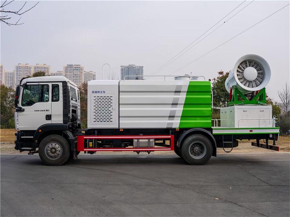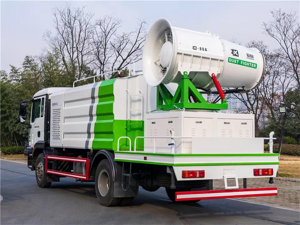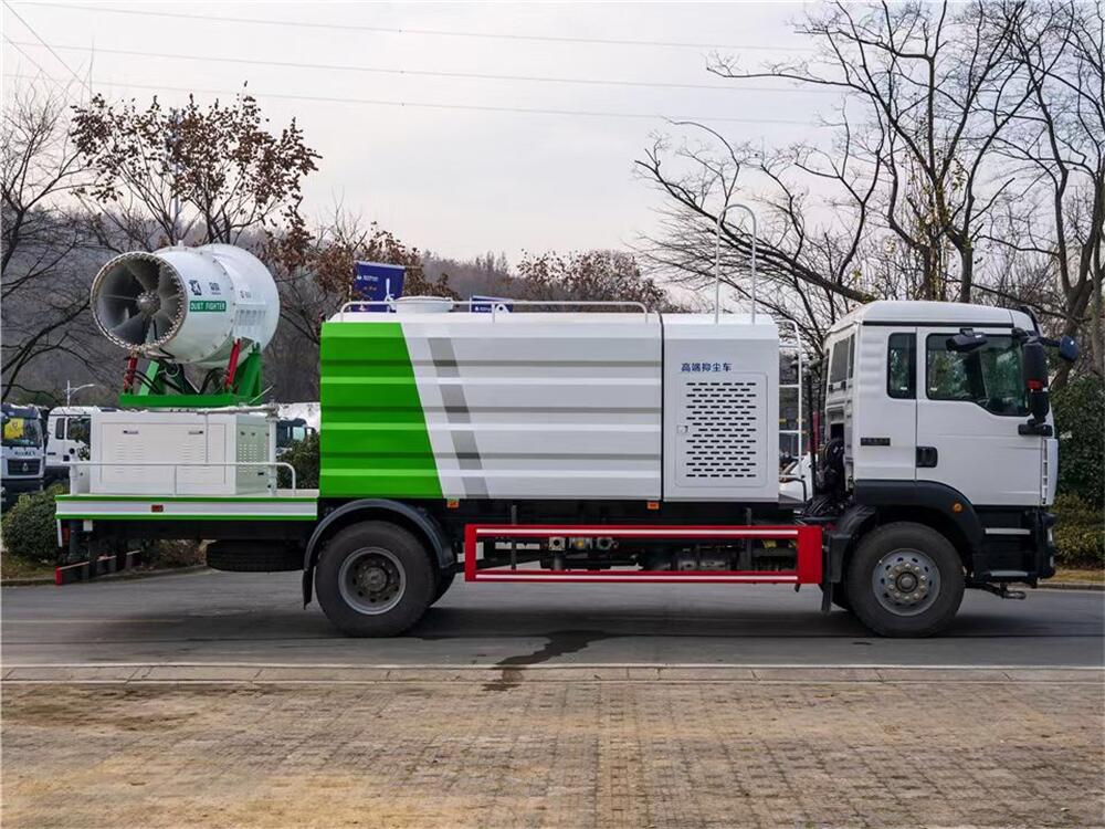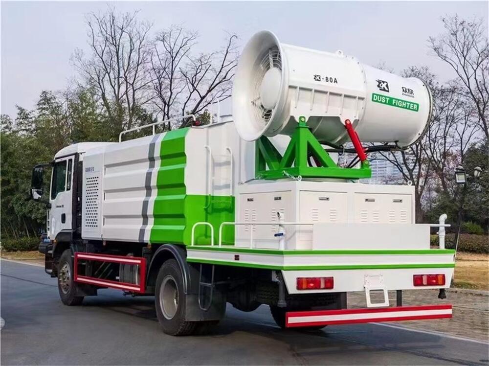 上裝配置:罐體容積為 12立方,選配風送式霧炮機組射程30米、40米、50米、60米、80米、100米、120米霧炮,罐體鋼板為4mm碳鋼Q235材質,罐內隔板具有防波作用,以減輕汽車行駛時罐體液體沖擊,罐體及整車外形尺寸按照公告。帶大功率專用灑水泵,泵可自吸自排,整車前沖、后灑、側噴、帶65消防接口,后平臺配CLW-50、CLW-60、CLW-80、CLW-100、CLW-120型風送式霧炮機組;罐體前封頭配大功率柴油發電機組;前封頭帶水位計,后平臺主管路帶1寸澆花接口,后爬梯。帶兩根輸水管及陰陽端。罐體顏色:銀/灰/綠,罐體兩側噴“多功能抑塵車”字樣,貼反光標示。