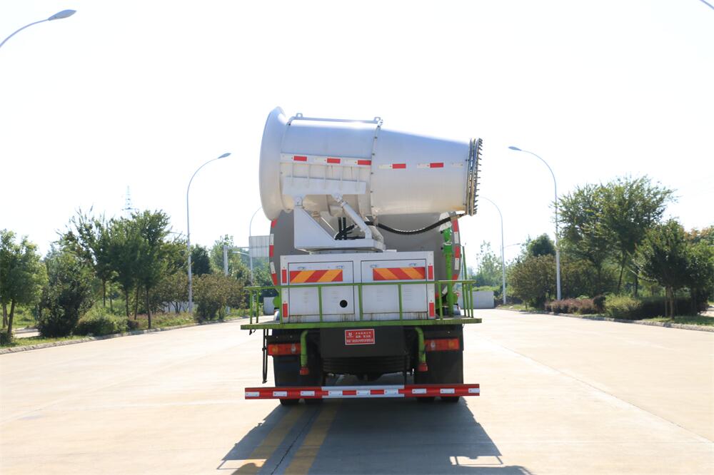 上裝配置:罐體容積為 12立方,選配風送式霧炮機組射程30米、40米、50米、60米、80米、100米、120米霧炮,罐體鋼板為4mm碳鋼Q235材質,罐內隔板具有防波作用,以減輕汽車行駛時罐體液體沖擊,罐體及整車外形尺寸按照公告。帶大功率專用灑水泵,泵可自吸自排,整車前沖、后灑、側噴、帶65消防接口,后平臺配CLW-50、CLW-60、CLW-80、CLW-100、CLW-120型風送式霧炮機組;罐體前封頭配大功率柴油發電機組;前封頭帶水位計,后平臺主管路帶1寸澆花接口,后爬梯。帶兩根輸水管及陰陽端。罐體顏色:銀/灰/綠,罐體兩側噴“多功能抑塵車”字樣,貼反光標示。