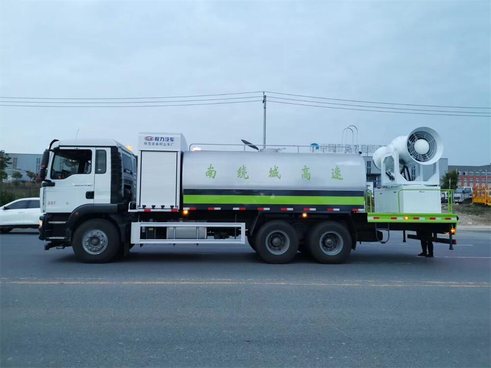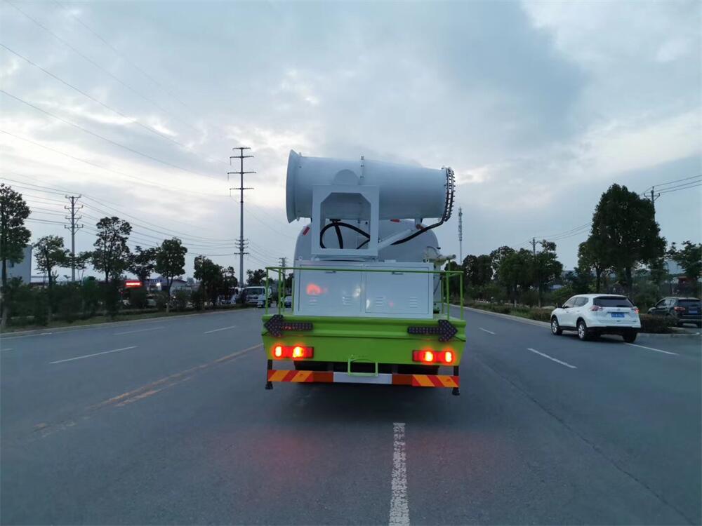 上裝配置:罐體容積為 16立方,選配風送式霧炮機組射程30米、40米、50米、60米、80米、100米、120米霧炮,罐體鋼板為4mm碳鋼Q235材質(zhì),罐內(nèi)隔板具有防波作用,以減輕汽車行駛時罐體液體沖擊,罐體及整車外形尺寸按照公告。帶大功率專用灑水泵,泵可自吸自排,整車前沖、后灑、側噴、帶65消防接口,后平臺配CLW-50、CLW-60、CLW-80、CLW-100、CLW-120型風送式霧炮機組;罐體前封頭配大功率柴油發(fā)電機組;前封頭帶水位計,后平臺主管路帶1寸澆花接口,后爬梯。帶兩根輸水管及陰陽端。罐體顏色:銀/灰/綠,罐體兩側噴“多功能抑塵車”字樣,貼反光標示。