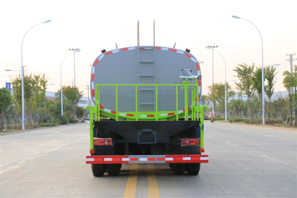 灑水車(chē)前裝有鴨形噴嘴或圓頭沖嘴,后面裝有圓柱開(kāi)灑水噴嘴或蓮蓬頭噴嘴,后部有一工作平臺(tái),裝配有水炮。后部還可裝8個(gè)噴嘴(選裝)。