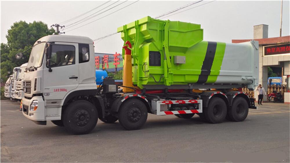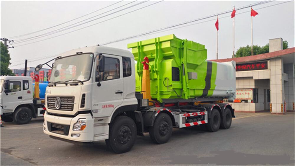 5、將汽車底盤倒進(jìn)車位,鉤起機(jī)箱,將垃圾運往垃圾處理場。